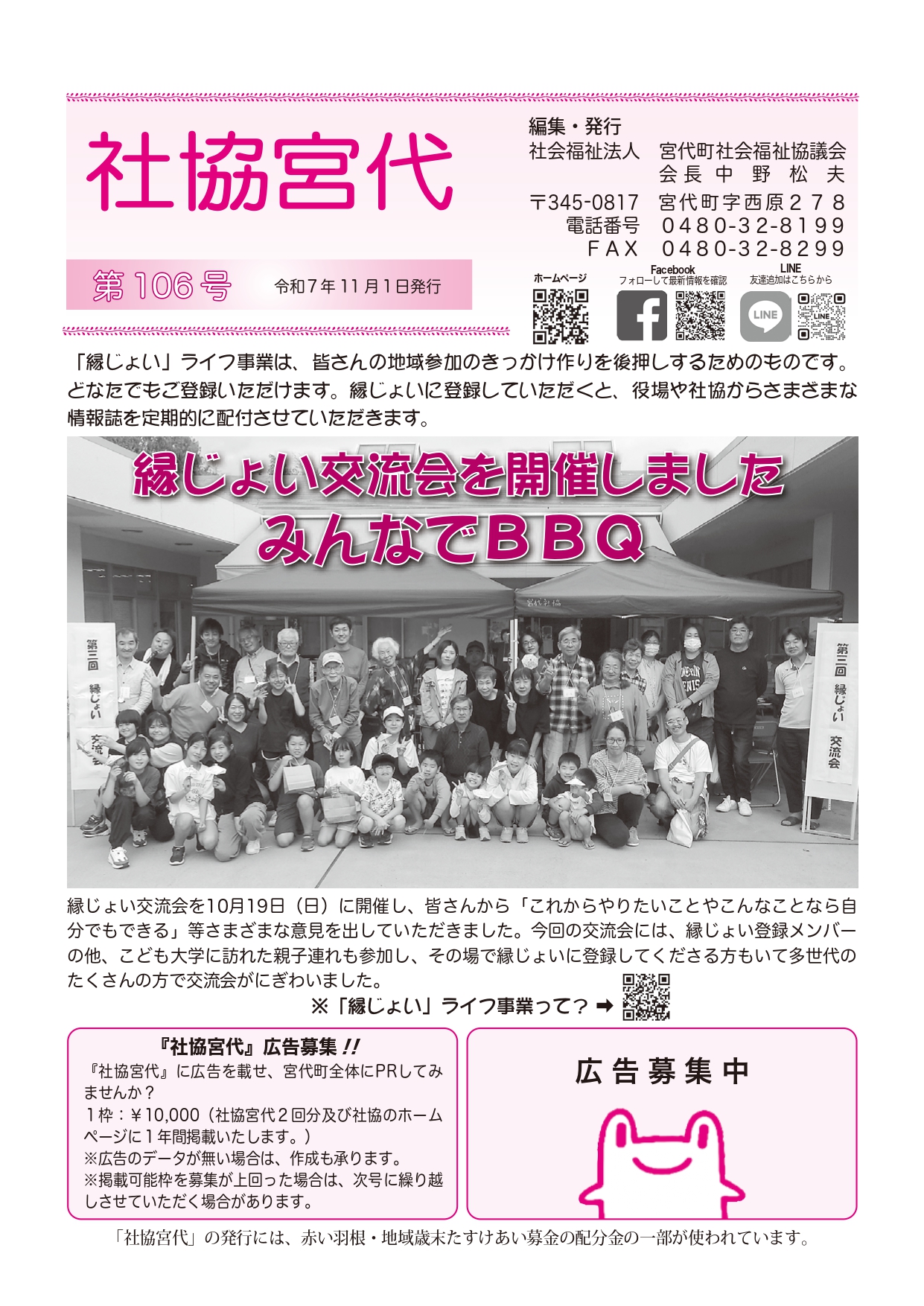 年3回発行している宮代社協の広報誌です。 地区・自治会経由で全戸配布されます。 『音訳ボランティアみやしろ』の音訳による”声の広報”もYouTubeにアップしています。 各広報の動画プレビューから聞くことができます。 チャンネル登録しておくと、アップされた際に気付きやすく、おすすめです。 R7.11月号 R7.8月号 R7.11月号 R7.11月号M1まつり・認知症関連事業・社協information・社協&日赤会費報告など中身を読む R7.8月号 R7.8月号高齢者向け事業・ボランティア特集・日赤奉仕団など中身を読む