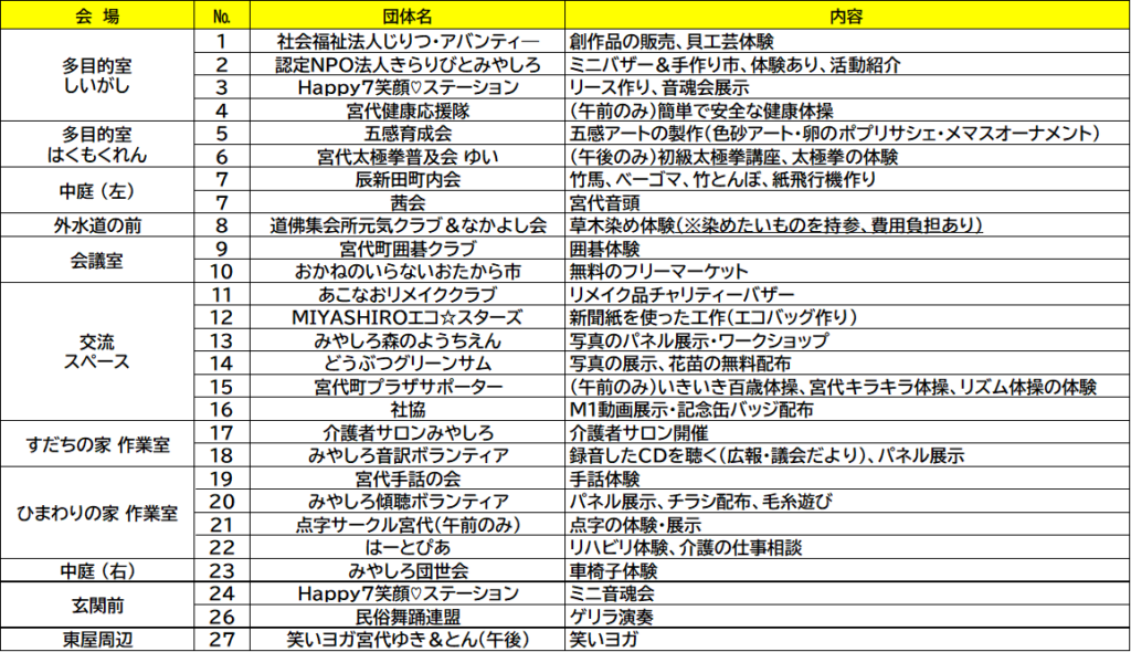 すてっぷ宮代活動チームに登録している団体が大集合!27団体が、様々な紹介・体験ブースをひらきます。