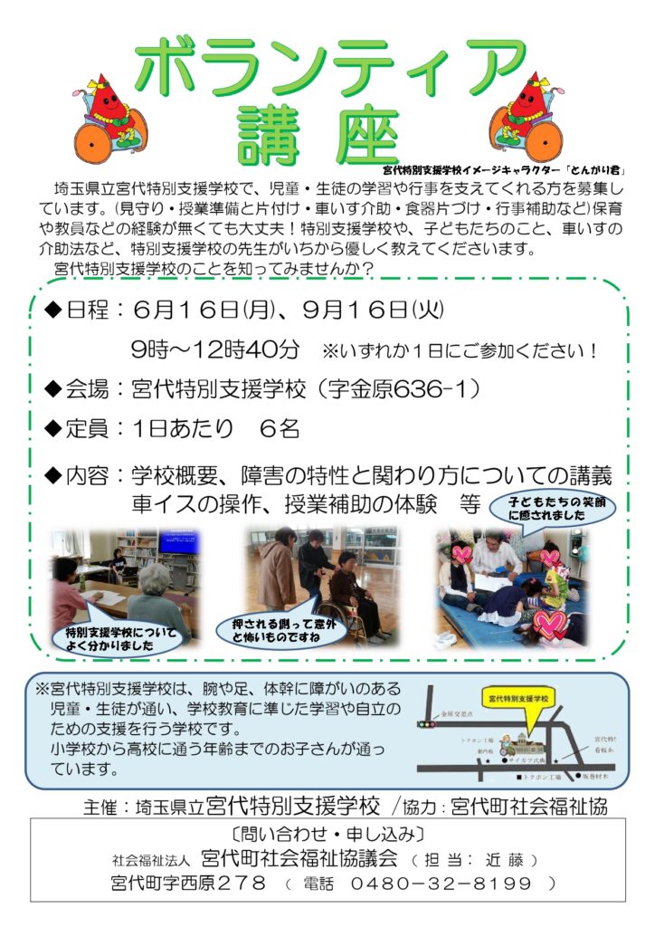 宮代特別支援学校で授業や行事のサポートをおこなっていただくボランティアさんを養成します。講義の他、特別支援学校内の見学や、車椅子体験等もございます。